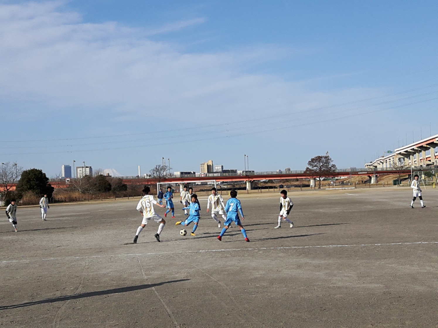 南の方向にはスカイツリーと、絶景の河川敷グランドでの試合。
